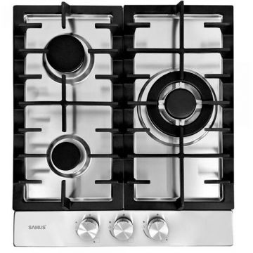 Samus Plita incorporabila Samus PSG-43SMGN1, 3 Arzatoare gaz, Gratare individuale fonta, Latime 45 cm, Aprindere electrica, Sticla Nano neagra mata